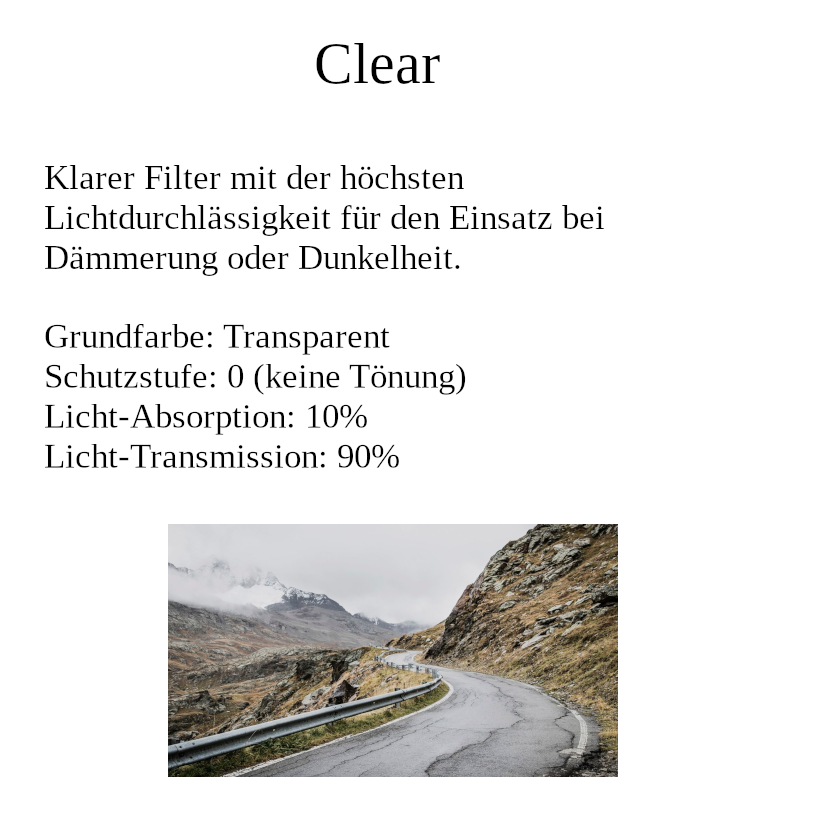 Klarer Filter mit der höchsten Lichtdurchlässigkeit für den Einsatz bei Dämmerung oder Dunkelheit.